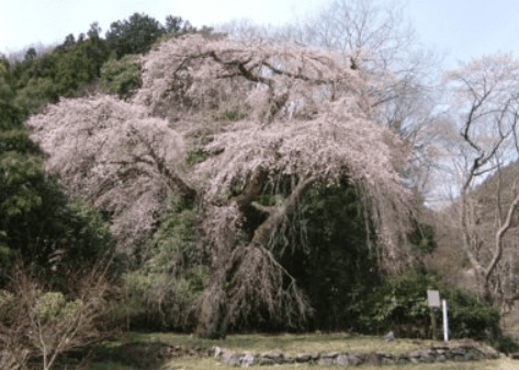 例年4月上旬から中旬にかけて見頃を迎え、満開時には淡いピンク色の花が滝のように枝から垂れ下がります。その姿は圧巻で、静かな山里の風景と相まって、訪れる人を魅了します。