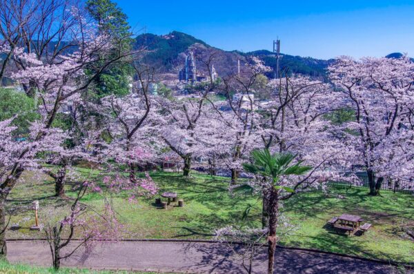 春になると、園内には約100本のソメイヨシノが咲き誇り、歴史ある城山の景観をやさしい桜色に染め上げます。例年4月上旬頃が見頃で、開花の時期には多くの花見客が訪れ、園内は華やかな雰囲気に包まれます。城山記念館や東屋、遊具なども整備されており、散策しながらゆったりと桜を楽しめるのが魅力です。