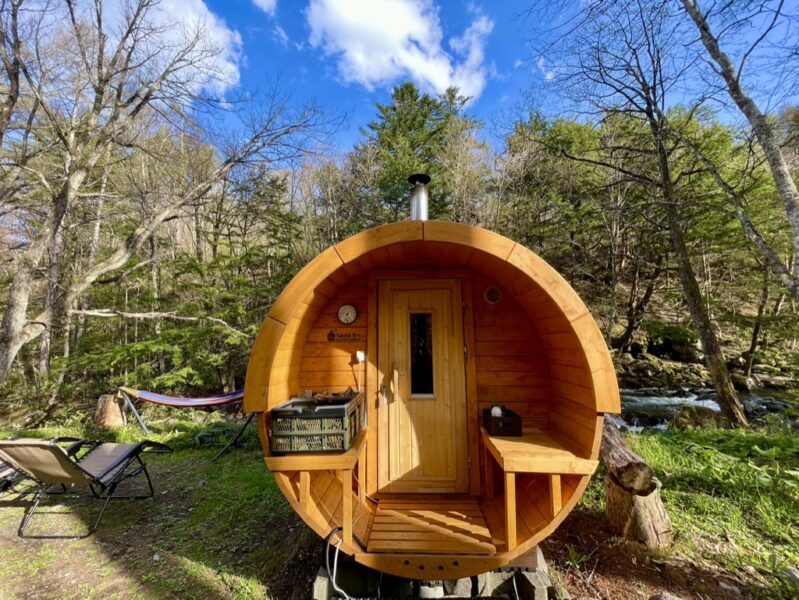 丸いバレルの中でセルフロウリュを楽しみ、目の前の清流を使った水風呂でキュッと締める流れが最高。水着着用なので、仲間や家族で入っても安心感があります。個室の休憩スペースや温水シャワーもあり、寒い季節でも切り替えがスムーズです。貸切なので子連れや友人同士でも気兼ねなく、松本でサウナを探している方はぜひチェックしておきたい一軒です。
