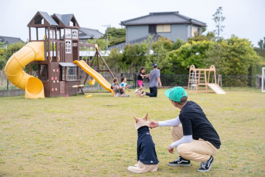 木更津市中島にある、2023年5月にオープンしたドッグラン、コワーキングスペース、イベントスペースとして利用できるマルチスペースです。東京湾アクアライン木更津金田ICから車で約1分、コストコ木更津金田倉庫とみたて海岸潮干狩場の中間地点にあります。敷地面積約600㎡の広々とした天然芝のドッグランで、滑り台、ビニールプール、サッカーゴールなど様々な設備が常設されています。最大の特徴は冷暖房完備の室内ラウンジがペットも利用可能で、屋外と屋内をリードなしで自由に出入りできることです。真夏の暑い日や突然の雨でも、室内で涼みながら愛犬が満足するまで遊べます。出入り自由で再入場も可能なため、近くの三井アウトレットで食事をして再び戻ってくるという使い方もできます。看板犬のフレンチブルドッグやミニブタも飼育されており、触れ合うこともできます。貸切利用やケータリングサービスも充実しており、企業のセミナーや誕生日会など多目的に利用できます。