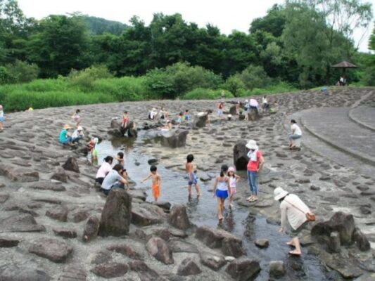 宮城県柴田郡川崎町にある国営みちのく杜の湖畔公園は、広大な敷地を持つ国営公園で、園内には水遊びができるせせらぎが流れています。みちのく杜の湖畔公園は宮城を代表する大型公園で、四季折々の花々や広大な芝生広場、遊具などが充実した宮城のレジャースポット。園内の水遊びエリア「じゃぶじゃぶ池」は夏季限定でオープンし、子どもたちに大人気の宮城の水遊びスポットです。じゃぶじゃぶ池は浅く安全に設計されており、小さなお子様でも安心して遊べる環境。水質管理も行き届いており、清潔で快適に遊べる宮城の公園です。園内には芝生広場やアスレチック、レンタサイクルなど多彩な施設があり、一日では遊びきれないほど充実しています。トイレや駐車場も複数箇所に完備されており、仙台市内から車で約40分とアクセスも良好。ペット連れでの入園も可能なエリアがあり、愛犬と一緒に宮城の広大な公園を楽しめます。水遊びと合わせて様々なアクティビティを楽しめる宮城を代表するスポットです。