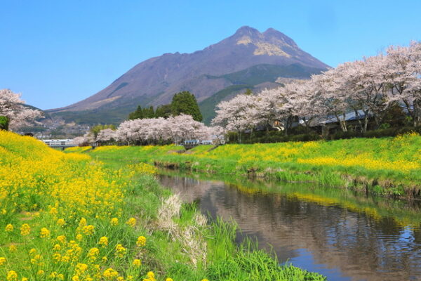 大分県由布市の由布院エリアを流れる大分川沿いには、春になると見事な桜並木が広がります。ゆふいん自然遊歩道を中心に、御幸橋から城橋にかけて川の両岸が桜とナノハナで彩られ、由布岳を背景にした春爛漫の風景を楽しめる人気のお花見スポットです。