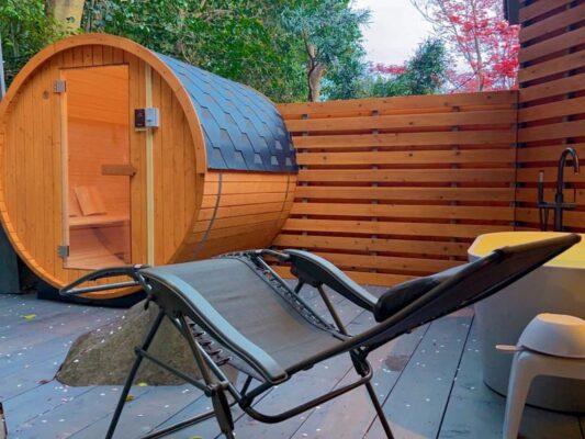 テラスに設置されたバレルサウナは定員4名で、セルフロウリュに対応。約90度のサウナ室で好きなタイミングでロウリュをかけながら、森の中にいるような静かな空間でじっくり蒸されます。水風呂は水道水をそのまま使っていて、夏場は受付で氷をもらえるのもありがたい。フルフラットのチェアが3脚置かれた外気浴スペースでは、人目を気にせず裸のまま風に当たれます。カップルや家族で水着なしで入れるのがプライベートサウナならでは。日帰り3時間から利用できますが、時間を気にせず過ごせる宿泊がやっぱりおすすめです。