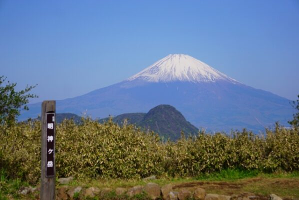 「明神ヶ岳」は箱根の外輪山のひとつで、標高1,169m。穏やかな山容が特徴で、山全体がカヤトや笹に覆われた開放的な雰囲気の山です。山頂からは金時山越しに富士山が見えるほか、大涌谷や芦ノ湖、相模湾まで広がる360度のパノラマが待っています。風に揺れる笹原の稜線を歩く時間は、ほかの山ではなかなか味わえません。