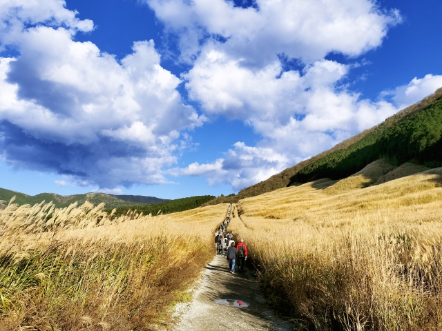 「仙石原すすき草原」は、箱根の「台ヶ岳」北西麓に約18万㎡にわたって広がるススキの名所です。「かながわの景勝50選」にも選ばれたこの草原には、約700mの一本道の遊歩道が整備されていて、両側を背丈ほどのススキに囲まれながら散策できます。見頃は9月下旬から11月上旬で、穂が黄金色に色づく10月中旬〜下旬は特に見ごたえがあります。夕陽に照らされてキラキラと輝く光景は、一度見たら忘れられません。