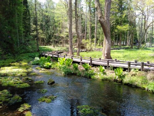 「姫川源流自然探勝園」は、長野県白馬村神城にある、日本名水百選に選ばれた姫川源流と隣接する親海湿原を合わせて楽しめるスポットです。国道148号線沿いの白馬さのさかスキー場第1駐車場(無料・約100台)が利用でき、そこから徒歩約10分で入口に到着します。入場無料で、全体を1周するのに約1〜1時間30分ほどかかります。