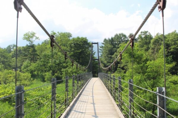 公園内を流れる姫川に架かる大出吊橋と、背後にそびえる白馬三山、茅葺き屋根の古民家が一枚の絵のように収まる景観は、白馬村を代表する風景として雑誌やポスターにも登場するほど。展望台まで少し登ると、その全景が一望できる絶好のビューポイントが待っています。吊橋を渡って遊歩道を歩けば姫川沿いをのんびり散策でき、本格的な白馬での登山前後に立ち寄るスポットとしても人気があります。春の桜(4月下旬〜5月上旬)や秋の紅葉(10月中旬〜下旬)など四季ごとの表情も豊かで、ぜひ季節を変えて訪れてみてください。