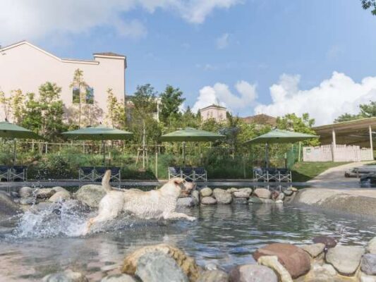 千葉県八街市にある「小谷流の里ドギーズアイランド」は、愛犬家に人気のラグジュアリーリゾート。わんちゃんと宿泊できるホテルや、ペット同伴可能なレストランを併設し、1日中愛犬と一緒に過ごせる複合施設です。総面積約10,000㎡を誇る全面天然芝のドッグランは、小型犬エリアと中〜大型犬エリアに分かれており、タープや屋根付きスペースも完備。さらに水深の浅い“じゃぶじゃぶ池”もあり、夏場は水遊びを楽しむ姿も見られます。走る・遊ぶ・くつろぐがすべて叶う、千葉屈指の本格派ドッグランです。