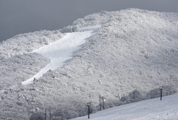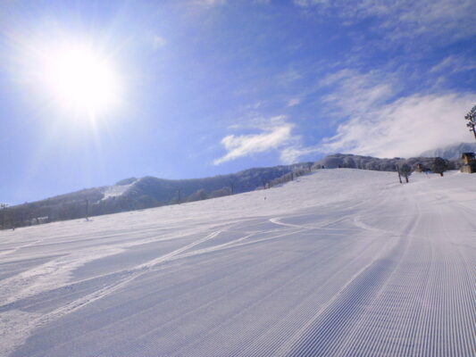 だいせんホワイトリゾートの中の原エリアは、大山の北斜面に広がるスキー場の中でも中級者に人気のゲレンデです。ブナ林に囲まれた扇型のワイドな1枚バーンが特徴で、上部へ行くほど斜度が増すコース設計になっているため、自分のレベルに合わせてステップアップしていけます。北向き斜面ならではの安定した雪質に加え、人工降雪機も備わっているのでシーズンを通じてコンディションが整いやすいのもうれしいところ。コース西側の林沿いは日が当たりにくく、板によくなじむ雪が残りやすいと評判です。