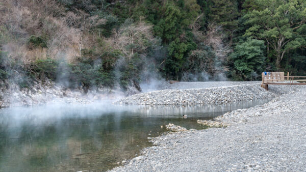 田辺市本宮町にある全国でも珍しい温泉で、大塔川の川底を掘ると70度の源泉が湧き出てきます。川辺に湧く温泉と清流が混ざり合い、自分だけの露天風呂を作ることができる全国的にも珍しい温泉です。水着着用で川遊びと温泉浴の両方を楽しめる貴重なスポットです。夏は川遊びをしながら温泉に浸かり、冬季(12月~2月)には川を大規模にせき止めて作られる「仙人風呂」が登場します。仙人風呂は長さ約40メートル、幅約13メートル、深さ約60センチの巨大露天風呂で、無料で利用できます。川湯温泉公衆浴場も整備されており、年間を通じて温泉を楽しめます。世界遺産の熊野本宮大社からも近く、観光と川遊び、温泉を一緒に楽しめる贅沢なスポットです。