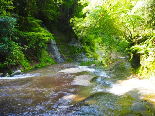 宇佐市院内町にある渓谷で、渓谷の先端にある「大飛の滝」までの約2キロメートルが、耶馬渓溶岩が造った大きな一枚岩の岩盤になっており、水流も穏やかなことから、自然林に囲まれた水流遊歩道が人気です。四季によって移り変わる景色も見事で、夏はたくさんの魚が泳ぐそばを素足で沢歩きができます。水深が浅いので小さな子どもでも安心です。さわやかな風と、ひんやり冷たい水の中、素足でお散歩が楽しめます。また、夏にはキャニオニング体験も可能で、6月中旬~9月末にかけて専門インストラクターのガイドのもと、渓谷を舞台に沢下りを楽しむアクティビティに参加できます。約1.5キロメートルのコース中に表れる10本の滝と5個の甌穴は、ウォータースライダーと飛び込みに最適です。紅葉も楽しめる自然の中、暑い日に涼しさを感じられる渓谷として人気を集めています。