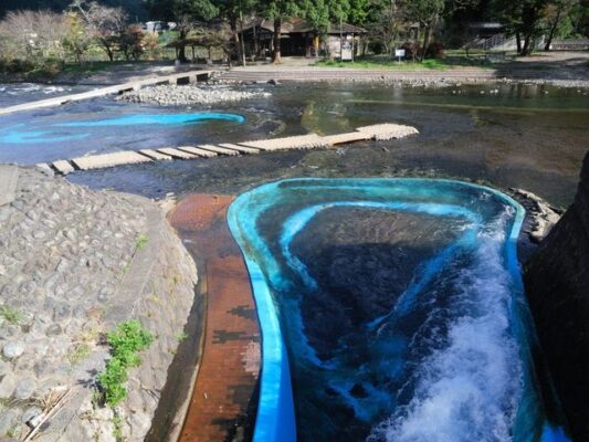 竹田市直入町にある日本名水百選に選ばれた河宇田湧水の横に位置する河川プールです。名水の湧き水を使ったプールは全国でも珍しく、透明度抜群の冷たい水で泳ぐことができます。夏休み期間限定で営業され、川の地形を生かしたオリジナルの天然スライダーが人気です。約70メートルの長さがあり、迫力満点と評判を集めています。スライダーに乗って川の中に飛び込めば、心も体もリフレッシュできます。スライダー用のマットは持参するのがおすすめですが、有料で貸し出しもあります(1個目返却時に半額返金)。更衣室やシャワー、トイレが完備されており、自然に恵まれたスポットながらも設備が整っているため、川遊びが初めての方でも安心です。川の近くには青々と茂るクレソンが群生しており、小魚が泳いでいる様子も見られ、大分の豊かな自然を満喫できます。