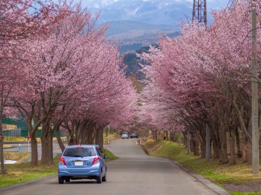 岩木山の麓、百沢から嶽温泉へ向かう県道沿いには、世界一の長さを誇る壮大な桜並木が続いています。約20kmにわたって約6,500本ものオオヤマザクラが植えられており、満開時には「桜のベルト」が山を囲うような圧巻のスケールを楽しめます。ドライブをしながら次々と現れる桜の景色は、まさにドラマチック。標高差があるため、麓から上へと順に開花していく様子も興味深く、訪れるタイミングによって異なる表情を見せてくれます。特に岩木山スカイライン付近からの眺めは、どこまでも続くピンクの列と広大な津軽平野を一望でき、弘前ならではのダイナミックなお花見体験が可能です。爽快な春の風を感じながら、日本一の桜ロードを駆け抜けてみませんか。