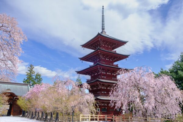 弘前を代表するシンボルの一つ、最勝院の五重塔。日本最北にある美しいこの塔と、周囲を彩る桜の組み合わせは、まさに日本文化の美学を凝縮したような光景です。約31mの威風堂々とした塔を背景に、淡いピンク色の桜が咲き誇る姿は、どの角度から切り取っても絵になります。特に、五重塔の朱色と桜の薄紅色のコントラストは、写真愛好家にとっても絶好の被写体。境内には他にも多くの桜が植えられており、落ち着いた雰囲気の中で歴史の重みを感じながらお花見が楽しめます。夜間には塔がライトアップされることもあり、夜の静寂の中に浮かび上がる五重塔と夜桜は、非常に幻想的で神秘的な魅力を放ちます。和の情緒にどっぷりと浸りたい方には欠かせない名所です。
