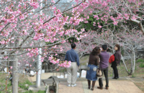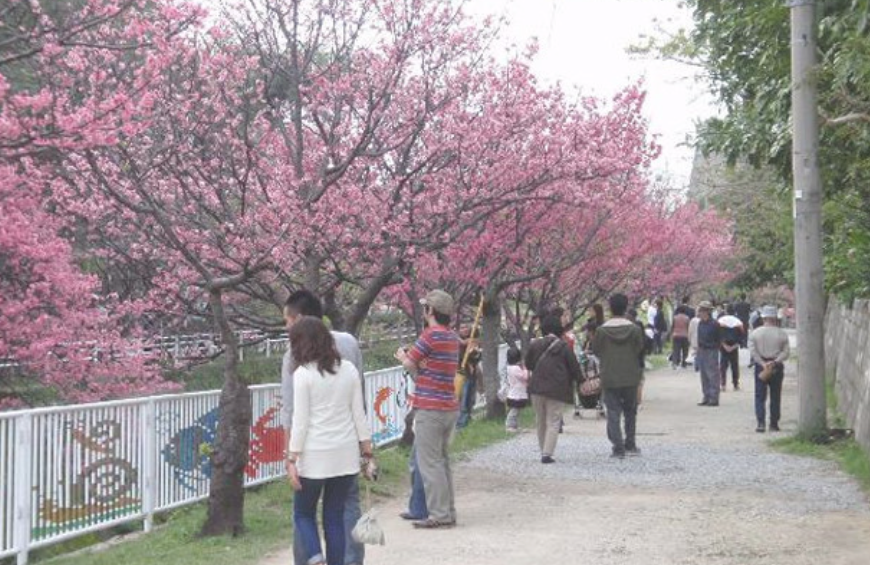 那覇市の中心部、国際通りからも徒歩圏内にある与儀公園は、市民の憩いの場として親しまれている桜の名所です。園内を流れる川沿いにカンヒザクラの並木が続き、水面に映るピンク色の花々を眺めながら、のんびりと都会の中のお花見を楽しめます。ヤシの木などの熱帯植物と桜が共存する様子は、まさに沖縄ならではの景観。毎年「なはさくらまつり」が開催され、苗木の販売や地元の出店で賑わいます。観光の合間にふらりと立ち寄れるアクセスの良さが魅力で、地元の方々が散歩をしたりベンチで寛いだりする日常風景の中に桜が溶け込んでいます。賑やかな那覇の街中にいながら、ホッと一息つける癒やしの空間。都会派のあなたにぜひ訪れてほしい、親しみやすさ満点の桜スポットです。