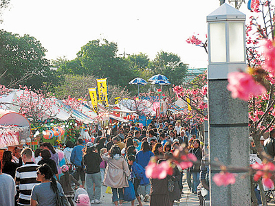 名護市の中心部に位置する名護中央公園(名護城跡)は、日本さくら名所100選にも選ばれている、沖縄を代表する桜の聖地です。標高差を活かした広大な園内には数千本のカンヒザクラが植えられており、山頂付近の展望台からは名護の市街地と美しい名護湾、そしてそれらを縁取る桜の絶景を一望できます。例年1月最後の土日には「名護さくら祭り」が開催され、歩行者天国となった大通りで行列や演舞が行われるなど、街全体が桜色のお祝いムードに包まれます。公園内の階段や遊歩道を登りながら、自分だけのお気に入りスポットを見つけるのも楽しみの一つ。名護の活気ある街並みと、穏やかな海の青、そして鮮やかな桜の色彩が一体となった風景は、沖縄の冬旅を華やかに彩ってくれます。