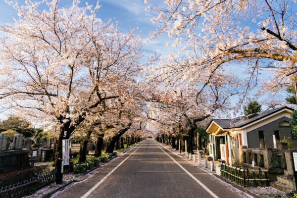上野の北側に広がる谷中エリア。その中心にある谷中霊園は、実は東京でも屈指の桜の名所として知られています。霊園を南北に貫くメインストリートは「さくら通り」と呼ばれ、道の両側から覆いかぶさるように見事な桜のアーチが形成されます。霊園という場所柄、非常に静かで落ち着いた空気が流れており、桜本来の美しさをじっくりと味わうことができる穴場的なスポットです。徳川慶喜をはじめ、多くの著名人が眠る歴史的な場所でもあり、歴史の重みを感じながら静かにお花見を楽しみたい方に最適。すぐ近くには「谷中ぎんざ商店街」もあり、食べ歩きを楽しみながらお散歩を続けるのも上野・谷中観光の定番コースです。賑やかなお祭り気分のお花見とはまた違う、心静かに春を惜しむような優雅な時間を過ごすことができます。