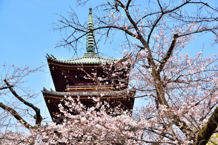 京都の清水寺を模して造られた清水観音堂は、上野公園内に佇む朱色の舞台が特徴的なお堂です。舞台の前には、江戸時代の浮世絵にも描かれた有名な「月の松」があり、その背後に広がる桜の景色は、まさに江戸時代にタイムスリップしたかのような情緒を感じさせてくれます。舞台の上から不忍池方面を見下ろせば、ピンク色に染まった公園のパノラマが広がり、上野の春を一望できる絶景スポットとして人気です。お堂の周囲には多くの桜が植えられており、朱色のお堂と薄紅色の桜のコントラストは、日本らしい美しさを存分に堪能させてくれます。歴史あるお寺の静謐な空気の中で、舞台からの特別な景色を眺める時間は、他では味わえない贅沢なひととき。散策の途中に立ち寄って、江戸の粋を感じる優雅なお花見を楽しんでみてください。