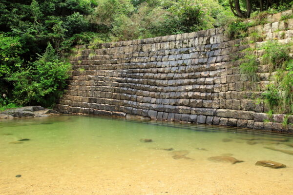 大津市上田上桐生町にある草津川の上流にある歴史的な砂防ダムです。明治22年(1889年)にオランダ人技術者ヨハネス・デ・レーケの指導の下に完成した土木学会選奨土木遺産で、歴史的価値も高いスポットです。足場が砂地で、水深が数十センチ程度の場所が多いため、小さな子どもやワンちゃんの水遊びにぴったりです。堰堤前は大人の首辺りまでの深さがあり、浮き輪で泳ぐこともできます。そこから少し上流へ歩くと、水深があって飛び込みができるポイントもあり、年齢に応じた楽しみ方ができます。川の水は透明度が非常に高く、川底まではっきりと見えるほどです。小さな魚もたくさん泳いでおり、網を持って魚採りを楽しむ家族も多く見られます。テントを張っている人も多く、木陰もあるため一日中ゆっくり過ごせます。草津市街地から車で約20分と気軽に訪れることができる人気スポットです。