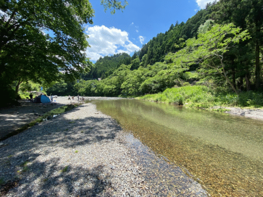せせらぎキャンプ場は、名栗川沿いに位置する川遊びに最適なスポット。キャンプ場ですが、川そのものの魅力が主役です。川は浅瀬エリアが多く、水が非常にきれい。透明度が高く、石の間を泳ぐ小魚も観察できます。流れは穏やかな場所が中心ですが、一部にはやや深さのあるポイントもあり、小学生以上なら泳いで楽しめるエリアもあります。川幅は中程度で、自然の地形を活かした変化があるのが特徴。浅瀬で水遊び、少し深い場所でプチ冒険、と年齢差のある兄弟でも遊び分けができます。木陰も多く、真夏でも比較的涼しい環境。川風が心地よく、長時間でも過ごしやすいのも魅力です。