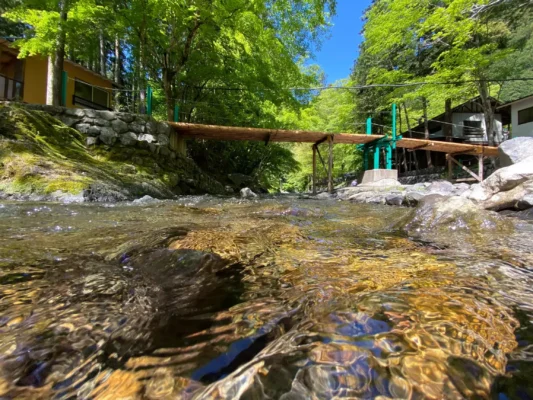 飯能市上名栗にある1600年代に建てられた古民家を受付にしたキャンプ場で、名栗川の清流沿いに位置します。穏やかな渓流の名栗川で安全に川遊びができ、程よくカーブになっており子どもを安心して遊ばせることができます。水深は30センチから50センチほどで、流れも緩やかです。川の水は透明度が高く、レッドリストに掲載されている魚や水生生物など希少な生態系を観察できます。水生生物の観察は夏休みの自由研究にも最適です。6月下旬にはホタルが舞い、幻想的な夜を楽しめます。年齢制限も設けているのでファミリーや落ち着いた利用者が中心で、夜も安心して過ごせます。SDGsの一環として環境宣言を表明し、森林保全や環境教育にも取り組んでいます。バンガローや屋根付きBBQハウスがあり、日帰り利用も可能です。