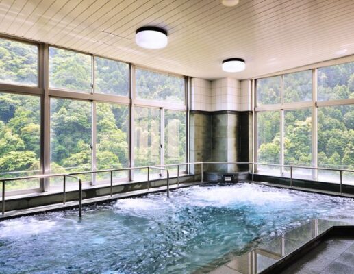 三好市の大歩危峡沿いに建つ「大歩危温泉 サンリバー大歩危」は、日帰り入浴もできる温泉宿です。大浴場は高層階にあり、眼下には小歩危峡や吉野川の渓谷美が広がる絶景ロケーション。露天風呂では季節ごとに新緑や紅葉、雪景色と移り変わる山の表情を間近に感じられます。泉質はpH9.5の強アルカリ単純泉で、浸かった瞬間にわかるとろりとしたぬめりが特徴。湯上がりの肌がしっとりつるつるになることから、地元では若返りの湯とも呼ばれています。化粧水いらずともいわれるほどの美肌の湯を、ぜひ体感してみてください。