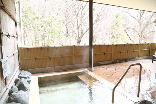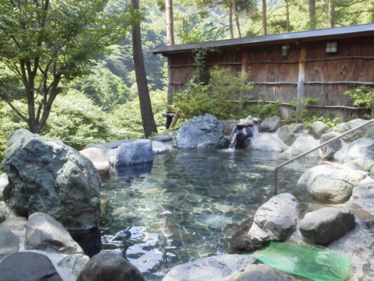 600年以上の歴史を誇る白骨温泉で、予約なしで気軽に日帰り入浴と食事を楽しめるのが「煤香庵」です。築250年の民芸調の建物に足を踏み入れると、囲炉裏や古い道具が並ぶ空間にどこか懐かしさが漂います。お風呂は自家源泉100%かけ流しの露天風呂で、白骨ならではの乳白色のお湯と硫黄の香りを存分に味わえます。炭酸成分を含んだなめらかな湯ざわりが心地よく、飲泉もできるので体の内側からもリフレッシュ。