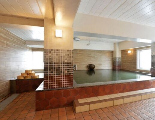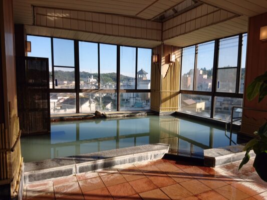 JR湯本駅から徒歩約1分という抜群の立地にある「旬味の宿 うお昭」は、前身が魚屋という経歴を持つ温泉旅館です。最上階にある展望大浴場からはいわき湯本の温泉街を見渡すことができ、眺めのよさも魅力のひとつ。源泉かけ流しの天然硫黄泉は循環なしで一晩中たっぷりと注がれており、湯量の豊富さを存分に感じられます。ピカピカの丸タイルが敷かれたレトロな浴室も雰囲気たっぷりです。