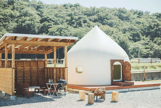山中湖ICから車で約3分の好アクセスな立地にある「moss camp field」は、花農家が作った静かなキャンプ場です。場内のほとんどのエリアから雄大な富士山を望むことができ、四季折々の絶景を楽しみながらのんびりと癒やしの時間を過ごせます。富士山の雪解け水が浸透した井戸水は、飲み水としても利用可能です。宿泊施設には、オプションでより広く利用できる「Cave」や「Analog」があり、自分たちに合わせたスタイルで滞在できます。無料シャワーや、お湯の出る室内の洗い場など、充実した設備も魅力。山梨名物の馬もつ煮や富士山麓牛のサーロインステーキといった地元食材のオプションも人気で、手ぶらでの来場も可能です。