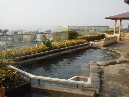 大津のおごと温泉の高台に位置する「びわ湖花街道」は、大正浪漫を感じさせるレトロな雰囲気が漂う温泉旅館です。日帰り入浴も可能で、露天風呂付きの大浴場を男女入れ替えで2種類楽しめます。弱アルカリ性のお湯はとろりとした肌触りが特徴で、古い角質をやさしく落としてくれる美肌の湯として評判。湯上がりに肌がしっとりツルツルになるのを実感できます。大浴場の中央には浮島のような木台が設けられていて、頭を乗せて体を伸ばしながらゆったり浸かれるユニークな造りも見どころです。バリアフリー対応の貸切風呂もあるので、小さなお子さん連れの家族にも安心。