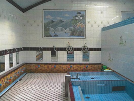 大津の石山エリアにある「容輝湯」は、1932年創業の歴史ある銭湯です。住宅街の中にたたずむ立派な唐破風屋根の外観が目印で、大津市の景観重要広告物にも指定されている趣のある建物。天然の地下水を薪で沸かしたお湯はまろやかでやさしく、体の芯からじんわり温まります。深風呂や浅風呂、ジェット風呂があり、寒い時期には週替わりの薬湯も楽しめるのがうれしいところ。浴室の壁に描かれた釉薬のタイル絵も、ぜひ近くで見てほしい見どころのひとつです。