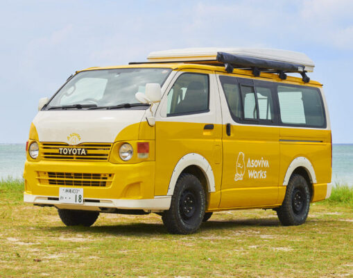 アソビバワークスは、「すべてを遊びに」をコンセプトにした沖縄・浦添市港川外国人住宅街を拠点にするキャンピングカーレンタルショップです。ハイエース・ジムニー・エブリィベースの「アソビバン」シリーズ全6台はすべてウッディ基調のオリジナルハンドメイド内装で、沖縄の青い空に映えるカラフルな外観が特徴的。Type1(ハッピーイエロー)・Type2(ちゅらミント)・Type3(ジムニー)・Type4(バタフライピーブルー)・Type5(ジムニーシエラ)・Type6(エブリィ)と個性豊かな6台が揃っています。