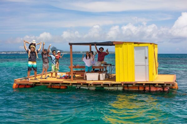 沖縄県本部町・美ら海水族館から車で約8分の渡久地港を拠点とする「海生活(マリンライフ)」は、地元海人(うみんちゅ)が営む本格イカダ釣り施設です。沖合に浮かべた大型イカダ(5〜8基・50〜80名収容)まで船で約10〜15分かけて移動し、水深18〜20mの豊かな海でのびのびと釣りを楽しめます。釣れる魚種が豊富で磯釣りより魚影が濃いと評判です。