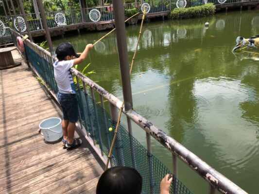 釣れる魚はティラピアで、50cm超の大物が釣れることも!食パンをエサにした釣りで、小さなお子様でも挑戦しやすいのが特徴です。釣り体験は1回300円とリーズナブルで、釣れた魚はキャッチ&リリースのルールのもと動物たちのエサになります。園内では乗り物体験や動物ふれあいなども楽しめるので、釣りとセットで1日たっぷり過ごせます。