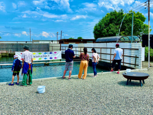 「釣り堀&つかみ取り&BBQ やったね!」は、岐阜県大垣市にある体験型施設です。養殖場で育てた元気なニジマスが泳ぐ釣り堀でのエサ釣りと、素手でニジマスを捕まえるつかみ取りが同じ場所で楽しめます。さらに食材を持ち込んでのBBQも可能で、一日中たっぷり遊べます。