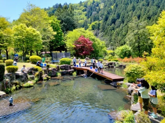 釣り上げた魚はその場で炭火焼きにして食べることができ(無料の炭焼き場あり)、揚げ代を支払えばから揚げにもできます。小さな子ども向けのつかみ取りコースもあり、ファミリーで一日楽しめます。デイキャンプ場(別途有料)も併設されており、岐阜・郡上観光の立ち寄りスポットとしても最適です。なお、雨天日は休園となるため、事前に公式サイトやインスタグラムで営業状況の確認をおすすめします。