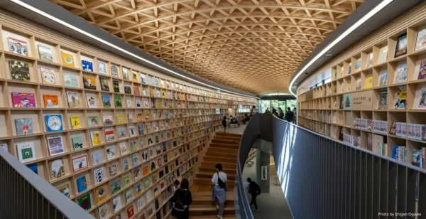 熊本市中央区の水前寺江津湖公園そばにある「こども本の森 熊本」は、建築家・安藤忠雄氏が子どもたちに贈った図書館です。床から天井まで壁一面に広がる本棚は圧巻で、約1万冊の本が10のテーマに分かれて並んでいます。まだ文字が読めない小さな子でも表紙を見て自由に本を選べる工夫がされていて、階段下には秘密基地のような絵本スペースも。天気のいい日にはウッドデッキや外のテラスに本を持ち出して、自然の中で読書を楽しむこともできます。