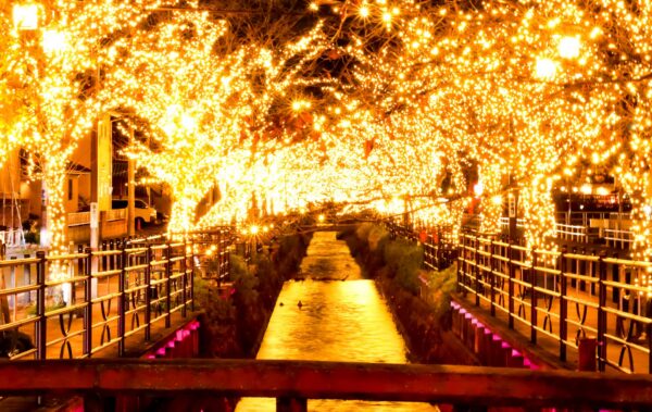 山梨県笛吹市の石和温泉にある「さくら温泉通り」で開催されるイルミネーションイベントは、冬の温泉街を彩る催しです。例年11月下旬から1月頃にかけて実施され、近津川沿いの桜並木が光に包まれ、夜の街並みをやさしく照らします。往復約3kmにわたるイルミネーションロードは、満開の桜を思わせる幻想的な景観が特徴。温泉街ならではの落ち着いた雰囲気の中で散策を楽しめます。周辺には足湯もあり、イルミネーション鑑賞とあわせて楽しめるスポットです。入場無料で気軽に立ち寄れるのも魅力です。