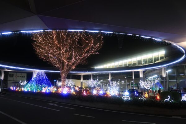 山梨県甲斐市の竜王駅は、建築家・安藤忠雄が設計した駅舎として知られています。コンクリートの幾何学的な造形と光が印象的な空間で、冬にはイルミネーションが実施されます。駅前広場ではキャンドルを用いた光の演出が行われ、建築と光が調和した落ち着いた雰囲気を楽しめるのが特徴です。南北の広場に広がるイルミネーションは、静かな中にも温かみのある景観を生み出します。入場無料で気軽に立ち寄れる、山梨の冬の穴場スポットです。