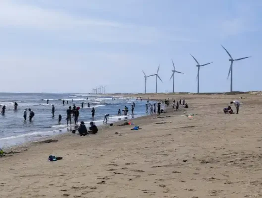 茨城の神栖市にある「日川浜海水浴場」は、鹿島灘に面した白い砂浜が美しい潮干狩りスポットです。神栖市内で唯一、貝の採取が認められていて、天然の鹿島灘はまぐりを無料で探せるのがうれしいポイント。真っ白な砂浜と太平洋の開放的な景色が広がり、海岸沿いに立ち並ぶ風車の眺めも絵になります。無料のシャワーや駐車場が整備されているので、お子さん連れでも快適に過ごせます。すぐ近くにはオートキャンプ場や温浴施設もあり、潮干狩りのあとにお風呂でゆっくり疲れを癒やすこともできます。アウトドアを一日たっぷり楽しみたい家族やカップルにぴったりです。