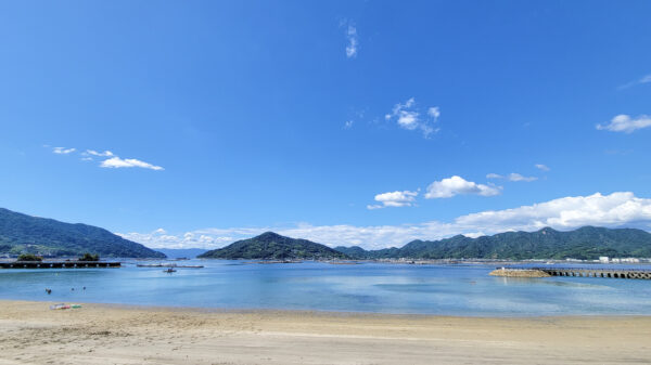 広島県江田島市にある「ヒューマンビーチ長瀬」は、約400mにわたる白い砂浜が広がる人工海浜で、春先には無料で潮干狩りが楽しめるスポットとして人気を集めています。ここで採れるのはマテ貝。砂の穴に塩をふりかけて、ひょっこり顔を出したところをつかまえるユニークな採り方が子どもたちにも大ウケです。遠浅で波も穏やかなので、家族みんなで安心して過ごせます。