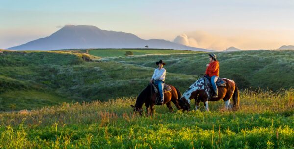 阿蘇市一の宮町に広がる「エル・パティオ牧場」は、乗馬・宿泊・レストランを備えたアクティビティリゾート型の牧場です。阿蘇山の一角に位置し、四季折々の草原や山々の絶景を満喫しながら乗馬体験を楽しめるのが最大の魅力。初心者から経験者まで幅広く対応したプログラムが揃っており、阿蘇の大自然の中で馬とともに非日常の時間を体験できます。宿泊施設は2024年に新棟がオープンし、全室テラス付きで阿蘇の草原が目の前に広がる贅沢な客室を完備。アメリカンダイナースタイルのレストランでは阿蘇の自然を眺めながら食事が楽しめます。黒川温泉へ車で約20分、JR宮地駅から車で約15分と観光拠点としても便利なロケーション。宿泊を伴う阿蘇旅行をお考えの方には特におすすめの牧場スポットです。