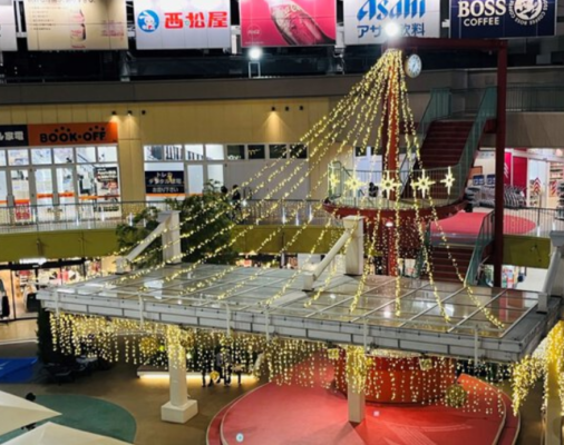 北九州市小倉の砂津エリアに立地する大型複合商業施設「チャチャタウン小倉」では、毎年冬になるとショッピングモール館内がイルミネーションで彩られます。チャチャタウン小倉の象徴といえば、高さ60m・直径50mの大型観覧車。通常でも小倉の街を一望できる人気スポットですが、冬のイルミネーション期間中は観覧車自体もライトアップされ、夜の小倉の街に輝く光の輪として存在感を放ちます。観覧車の車窓から眺める小倉の冬の夜景は、この時期ならではの特別な体験です。館内では毎日イベントも開催され、ショッピングやグルメを楽しみながら光の空間を満喫できます。JR小倉駅から西鉄バスで約5分とアクセスも良く、子ども連れのファミリーから大人のカップルまで幅広い層に人気の冬のスポットです。