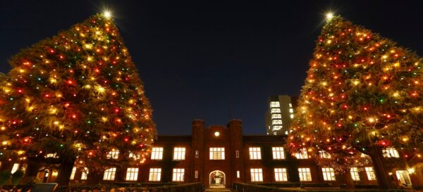 1874年にアメリカ聖公会宣教師によって設立されたキリスト教系の大学・立教大学では、毎年11月末から翌1月6日(キリスト教の暦による「顕現日」)まで、池袋キャンパスのシンボルであるヒマラヤ杉がクリスマスツリーとして光り輝きます。樹高約20mに達するヒマラヤ杉のイルミネーションは、赤レンガ造りの重厚な本館校舎を背景に温かな光を灯し、大学キャンパスならではの落ち着いた雰囲気のクリスマス空間を演出します。点灯式では聖歌やハンドベルの響きとともに光が灯り、クリスマス期間中は学生のクリスマス実行委員会が企画するコンサートやキャロリングなどのイベントも開催されます。池袋駅西口から徒歩7分と少し歩きますが、喧騒から少し離れた静かで上品なクリスマスの雰囲気はここならではの魅力です。一般の方も無料で見学できます。