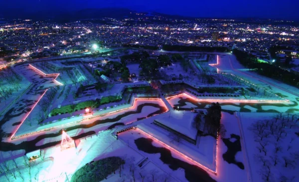 函館のシンボル・特別史跡「五稜郭跡」の星形の堀を電球で縁どるイルミネーションイベント「五稜星の夢(ほしのゆめ)」は、2024年度で36回目を迎える冬の函館の風物詩です。約1.8kmの堀全体が約2,000個の電球で照らされ、地上に巨大な光の星形を浮かび上がらせる幻想的な光景は、五稜郭タワーの展望台から見下ろすことで最もよく楽しめます。雪が積もると白銀の大地に浮かび上がる星形がより一層くっきりと輝き、北海道の冬ならではの絶景が広がります。開催期間は例年12月1日から翌2月末まで、日没から19時まで点灯しています。なお五稜郭タワーの営業時間は18時までのため、展望台から鑑賞したい場合は早めに訪問するのがポイントです。はこだてクリスマスファンタジーと同時期のクリスマスシーズンには、函館の街全体がイルミネーションに彩られます。