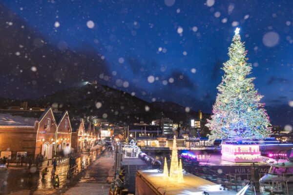 1998年から始まった「はこだてクリスマスファンタジー」は、函館・金森赤レンガ倉庫群前の海上に毎年浮かぶ巨大クリスマスツリーが目玉の函館冬最大のイベントです。カナダの姉妹都市・ハリファックス市から空輸される本物のモミの木に約15万個のイルミネーションが施され、港の夜景とともに幻想的に輝きます。最大の見どころは毎日18時のツリー再点灯の瞬間で、カウントダウンとともに打ち上げられる冬花火とツリーの光が競演し、ベイエリアが一瞬にして光に包まれます。また1日3回(18時30分・19時30分・20時30分)、各約15分だけツリーが真っ赤に染まる「プレミアムレッドツリー」の演出も必見です。会場周辺では地元食材を使ったスープバーも出店し、寒い夜に体を温めながら楽しめます。開催期間は例年11月末から12月25日までと短いため、日程の確認が必須です。