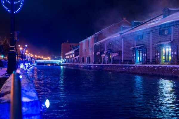 北海道随一の観光地・小樽の象徴「小樽運河」では、毎年11月から1月末にかけて青色LEDによるイルミネーションが施され「青の運河」として親しまれています。石造りの倉庫群とガス灯が立ち並ぶ歴史ある運河沿いが、冬季限定の1万球の青い光で幻想的に彩られます。特におすすめは日没直後の「ブルーアワー」の時間帯で、イルミネーションの青と夕暮れの空の蒼が溶け合い、どこか別の世界に迷い込んだような神秘的な景色が広がります。期間中は青色のイルミネーション装飾をまとった運河クルーズ「ナイトクルーズ」も運航されており、水面に映る光を間近で楽しむ贅沢な体験も人気です。小樽の観光散策と組み合わせて、冬ならではの情緒ある夜の小樽を存分に満喫してみてください。