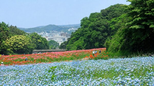 「横須賀市 くりはま花の国」は、海に近い横須賀エリアで季節の花を楽しめる広い公園です。春はネモフィラの青が園内を彩り、ポピーやハーブ園なども一緒に見られる時期があります。関東で花畑を見ながら、子どもと外遊びも楽しみたい日にぴったり。ゴジラのすべり台がある冒険ランドや園内を走るフラワートレインもあり、家族のおでかけにもカップルの散策にも使いやすいですよ。