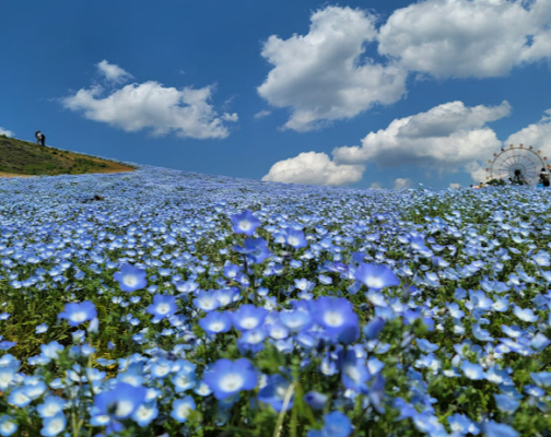 「国営ひたち海浜公園」は、関東でネモフィラを語るなら外せない大人気スポットです。春のみはらしの丘には青い花が一面に広がり、空と海までつながるような景色を楽しめます。写真を撮るだけでなく、園内の遊園地や広場で遊べるので、子連れでも一日過ごしやすいですよ。カップルなら、花畑を歩きながらゆっくり季節を感じるデートにも合います。