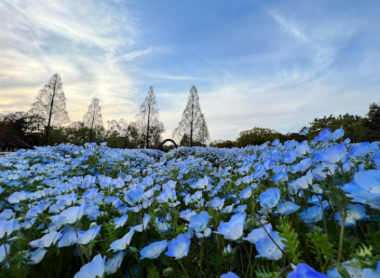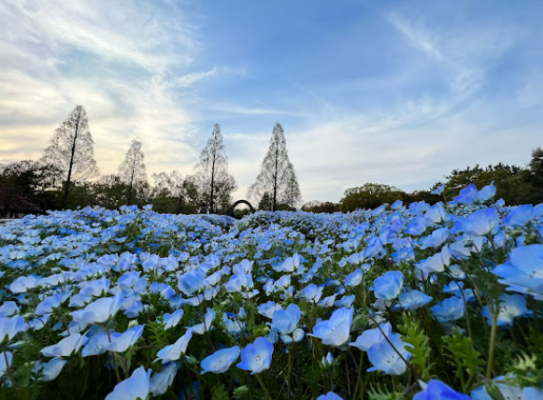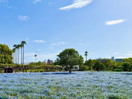 実際に訪れた方の口コミでは、敷地が広くてゆったり遊べたという声や、花壇の手入れが行き届いていたという感想が多く上がっています。最寄り駅は御堂筋線の新金岡駅で徒歩約15分ほど。入園無料で大阪のネモフィラスポットとしても穴場的な存在なので、のんびりお花見したい家族やカップルにぴったりです。